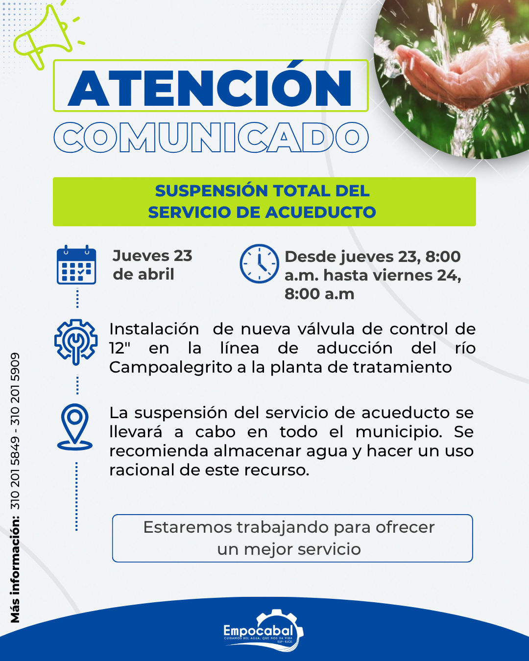SUSPENSIÓN PROGRAMADA EN EL SERVICIO DE ACUEDUCTO PARA EL DÍA JUEVES 23 DE ABRIL DESDE LAS 8:00 AM HASTA EL VIERNES 24 DE ABRIL A LAS 8:00 AM (24Hrs)